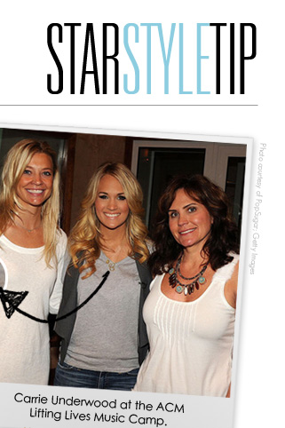 Carrie Underwood recently added a polished touch to a grey tee, vest, and jeans with her gold script “C” pendant necklace. The West Avenue Jewelry script initial necklace ($135 to $330) has a similar design and is available in a variety of metals. Carrie makes the classic pendant look young and modern by layering it with another short goldtone pendant necklace.