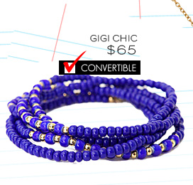 Add value to your jewelry purchase by styling it multiple ways. The Blue Bijoux cross convertible bracelet ($26) and the Gigi Chic blue beaded convertible bracelet ($65) can each be worn as a wrap bracelet one day and a long necklace the next.