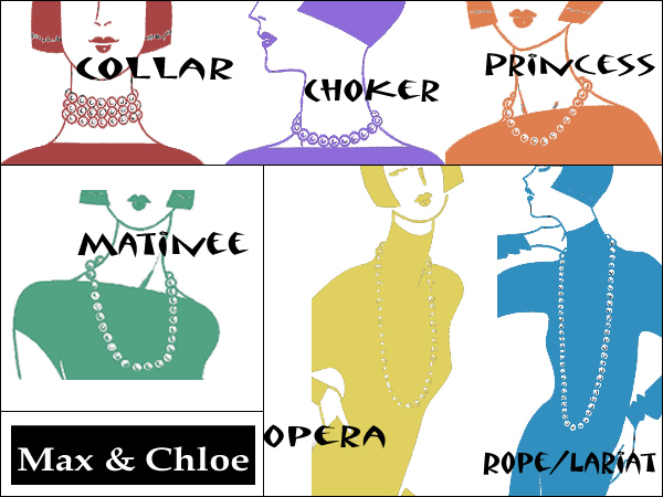 Opera. The opera necklace length is gorgeous and refined. It can be worn in one strand for a polished look or doubled as a two-strand choker length piece. The style is very “flapper”-like. This necklace is very flattering for shorter women because it elongates the body. Length: 28-34 inches.