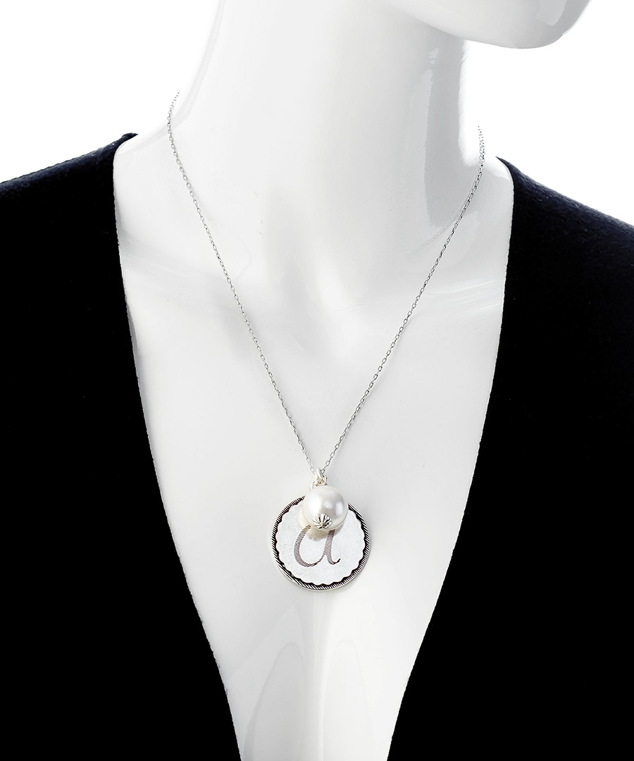 Express your style with this John Wind Sorority Gal silver initial and pearl necklace. A large, silver coin pendant can be personalized to display any individual initial. A beautiful pearl hangs on the side of the coin, giving the necklace that feminine touch of class. The thin anchored chain makes this necklace a delicate wonder.
