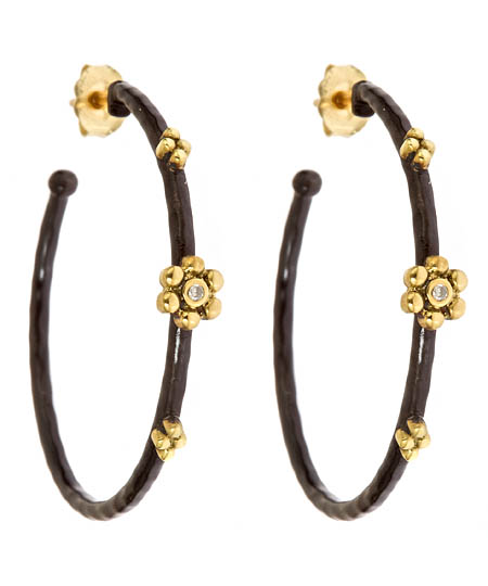 With the open flower hoop earrings by Jordan Scott, you can be certain that both flowers and diamonds are a girl’s best friend. An open flower design rests in the center with two 18k gold pieces on either side. A small diamond collects in the middle of the flower, which all lies on wonderfully crafted black rhodium.