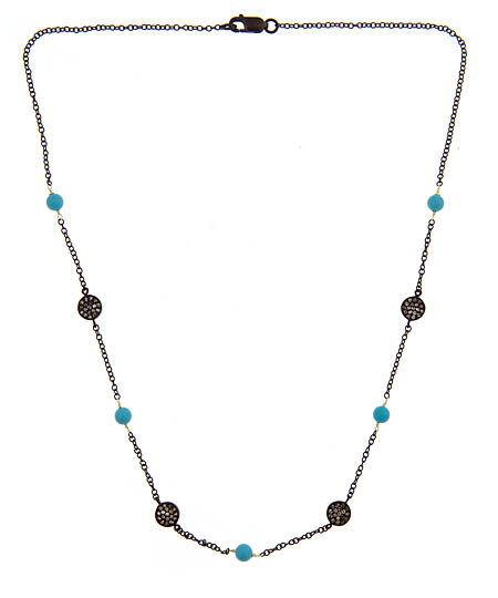 Drape your neck in this stylish turquoise and pave disc necklace by Jordan Scott. Five turquoise beads cascade along the necklace with four pave diamond discs sitting in between the stones. The turquoise beads are connected to the black rhodium chain by 14k gold.