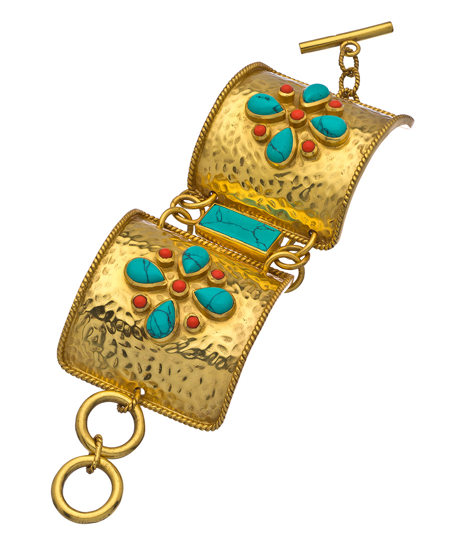 Fall in love with this Julie Vos Eve gold, turquoise and coral double panel cuff bracelet. If it's a statement piece you're looking for, Eve is your girl. The burnished cuff with braid trim has lovely fleur-de-lis gemstone pattern set into its gold surface. Bracelet fastens with a toggle clasp.