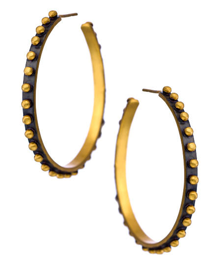 Bold, sleek and modern, these Julie Vos gold Soho hoop earrings are exquisitely crafted. Small, studded and burnished gold dots grace the rim of the hoop, with color and texture enhanced by the dark background, Black and gold has never looked so good! Earrings have a post closure for pierced ears.