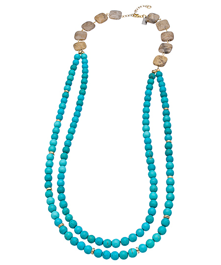 For a gratifying statement look, the fossil coral and turquoise double beaded necklace from K. Amato is an excellent choice! Every aspect of this indigenous necklace satisfies, from the vibrant color of the double strand of turquoise beads, to the gorgeous style of the striking fossil coral stones.