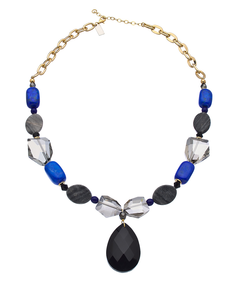 K. Amato's stunning gold and black teardrop nugget pendant necklace is the perfect finishing touch for your favorite ensembles. Striking cobalt blue beads provide a fantastic pop of color in this lovely treasure that you will be proud to own and wear. Necklace fastens with a lobster claw clasp.