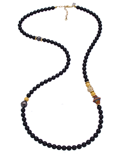 There are so many interesting elements in this K. Amato long, gold, pyrite, crystal and black beaded necklace. Jet black, polished beads are enhanced with gold beads, pyrite beads, crystal studded and ornamental beads. The statement you'll make is one of elegance and refinement. Necklace has a lobster clasp closure.