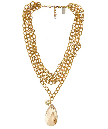 The Torrence necklace by K. Amato is a unique piece with a dramatic look. The entire piece exudes a gorgeous brilliance, notably due to the large champagne colored crystal that is showcased at the bottom of the piece. Layers of gold chain links comprise the necklace, complimenting the stone perfectly.