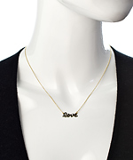 Simple, stunning and straightforward, this Kacey K Fine Jewelry gold and black diamond script 'love' necklace is meant to show the one you love exactly how you feel... or to tell the world 'Hey! This is where I'm coming from!' Available in your choice of gold or rose gold, the enchanting type is depicted in black diamonds and joins two lengths of chain, fastening with a lobster claw clasp. Please specify gold or rose gold when ordering.