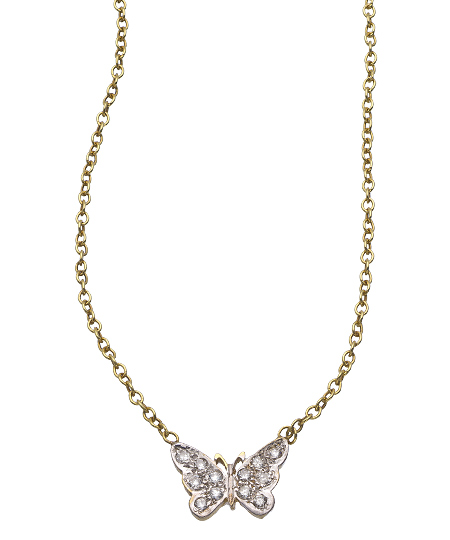 Fluttering by, a butterfly lands at the base of your lovely neck... only this isn't just any winged beauty, it's Kacey K Fine Jewelry's gold and mini diamond butterfly necklace - alight with sparkle and a field of shimmering diamonds in a white gold setting. An ideal layering necklace, it will also delight when worn as a solo accessory. Necklace fastens with a spring hook clasp.