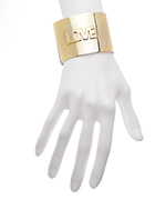 Love and jewelry are really all you need in life. Rock some eighties style with this thick cigar band cuff bracelet that features the love motto in raised hammered gold.Font is uppercase print. Bracelet is 1.75 inches wide.