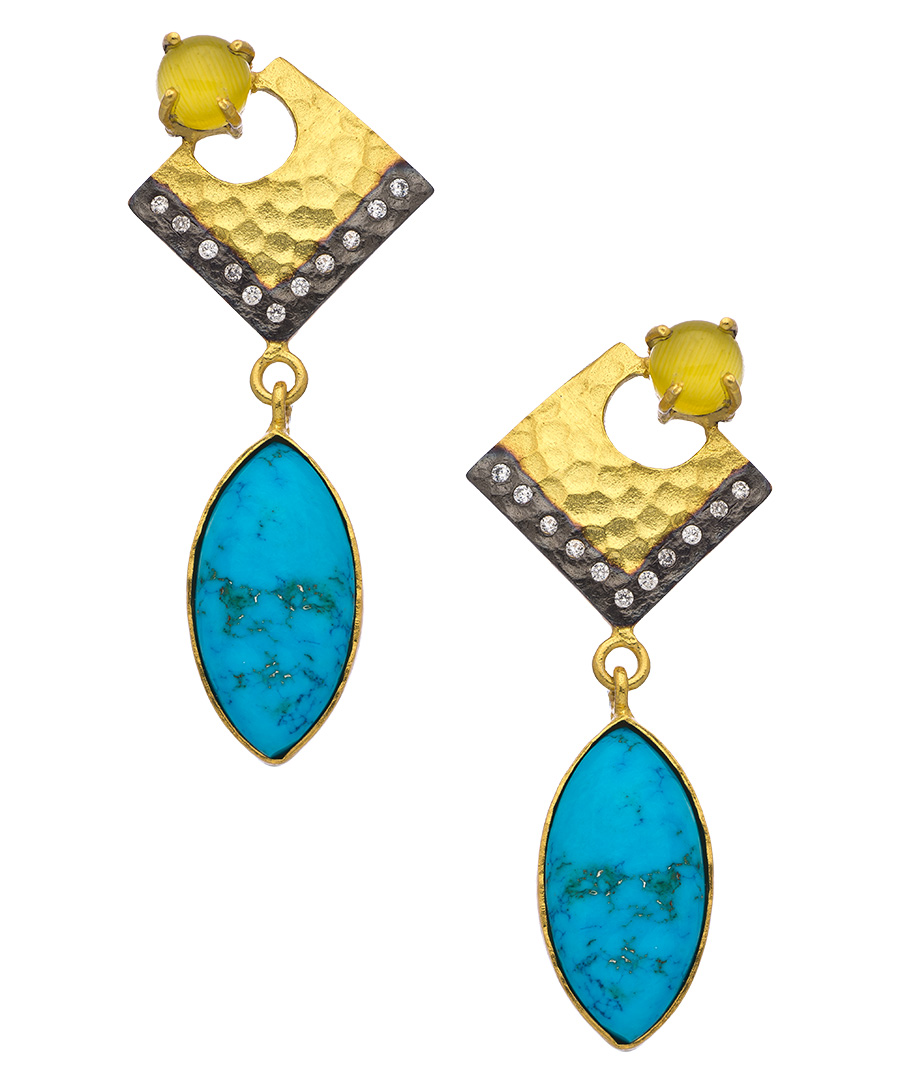 These Kanupriya gold, turquoise, CZ and moonstone drop earrings will elevate your look to lofty heights. Sumptuous turquoise and yellow moonstones make these dazzling danglers really special - perfect for your favorite looks. Earrings have a post closure for pierced ears.