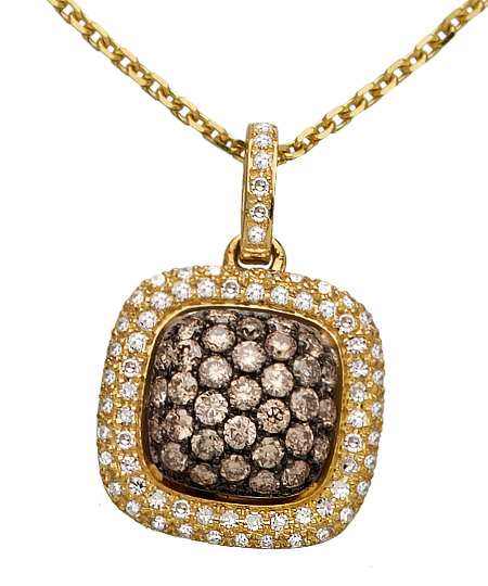 This champagne diamond cluster necklace by KC Designs is crafted in lustrous beauty. The bevy of champagne diamonds is wonderfully complemented by the 14k yellow gold backdrop. The small square pendant drops from a 16-inch chain.