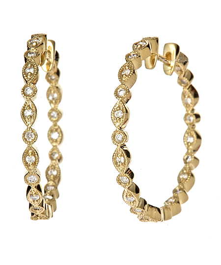 KC Designs yellow gold diamond inside out hoop earrings are gorgeously unique pieces for your fine jewelry collection. 14k yellow gold hoops are adorned with .34 carats of shimmering diamonds. The diamonds embellish the outer front half and the inner back half of the earring for a twinkling appearance the whole way around. This pair measures 20 mm in diameter. Continuous hoop post for pierced ears.