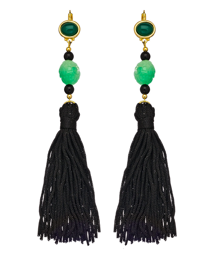With a look that would fit in a Bollywood movie, the black and green tassel shoulder duster earrings from Kenneth Jay Lane are all drama. Wear them out dancing and watch them move right along with you. These earrings fasten with hinged lever back closures for pierced ears.