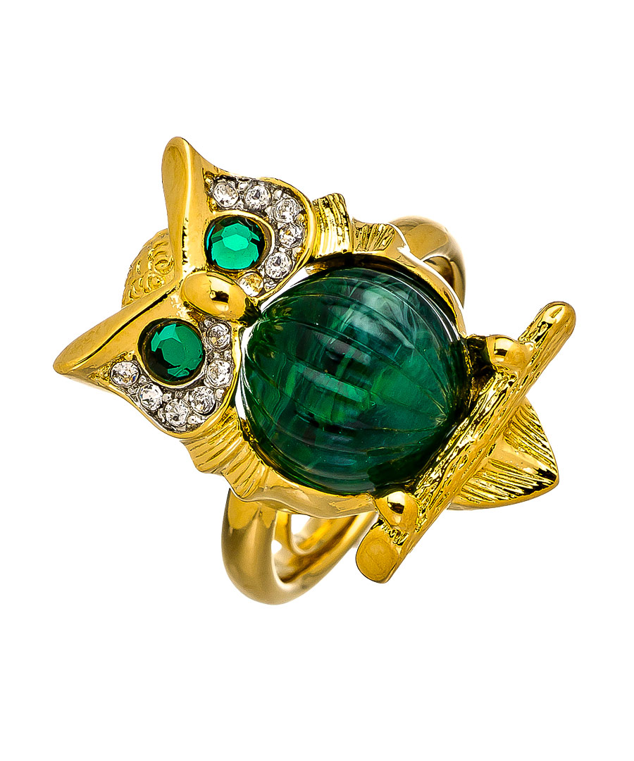 For something outside of the box try the green owl crystal cocktail ring from Kenneth Jay Lane. On top of the rounded gold plated band sits the cutest little owl. The owls eyes are made from green Austrian crystals and surrounded by white Austrian crystals.