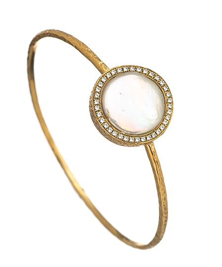 Have you ever seen anything as lovely as this elegant pearl kori bangle from KiraKira? A stylish gold hammered bracelet flaunts a pave sapphire pearl framed with brilliant cubic zirconia stones. Wear it to add a touch of class to your ensemble.