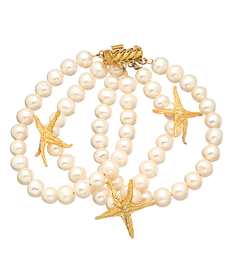 Nothing will stand out more than this lavish starlette pearl bracelet from KiraKira. The multi-strand bracelet features three rows of 8-9mm white pearls and three gold vermeil textured starfish for an added stylish flare. It complements countless looks and outfits.