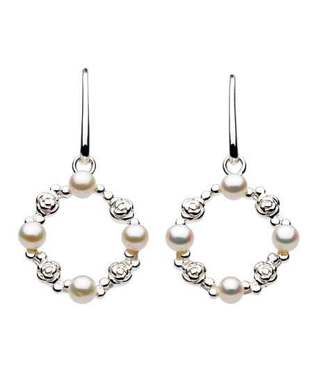 Simple yet elegant, the rose and pearl circle drop earrings by Kit Heath are a perfect way to make sure you have all you need to look your best. These tiny wreath shaped beauties feature sterling silver roses alternating with four miniature pearls. The earrings are an angelic finish to your look.