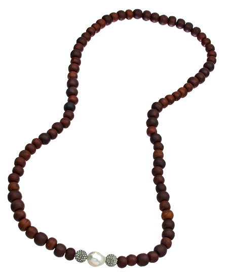 This exquisite Krystal Sasso wood pearl crystal necklace marries a marbled pearl, two swarovski crystal balls, and bodhi beads from Nepal. For the woman who's looking to make a spirited style statement, this beautiful cocoa colored necklace will steal the show. It's the perfect eclectic touch to amp up your casual look.