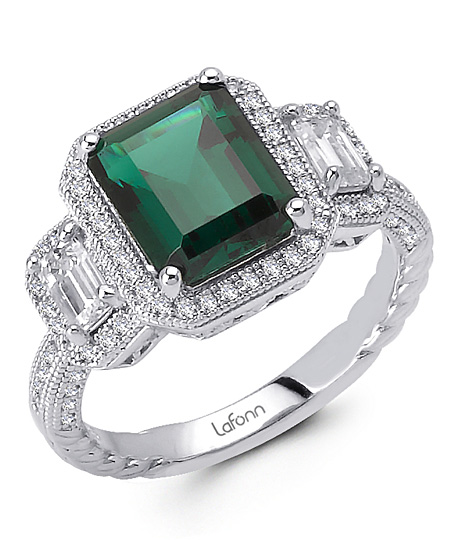 Step out in exquisite style when you're wearing the regal emerald cut emerald color ring from Lafonn. The green stone in the center is a simulated emerald in an emerald cut. The prong set piece is surrounded by small cubic zirconia and two larger prong set cubic zirconia stones flank each side.