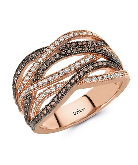 Prepare to be wowed by the silver and rose runner ring from Lafonn. Multiple rows of oxidized silver and rose gold tone sterling silver intertwine together to form a unique wave design. Simulated diamonds cover each row making the piece irresistible.