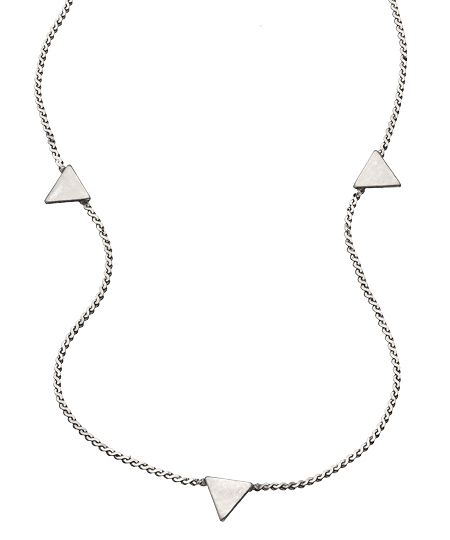 This striking antique silver pod necklace from Le Mos flavors outfits with a dash of drama. The thin necklace features three tiny triangles for a contemporary flair. Let it linger over a flowy tunic or mingle it with other necklaces for more impact.