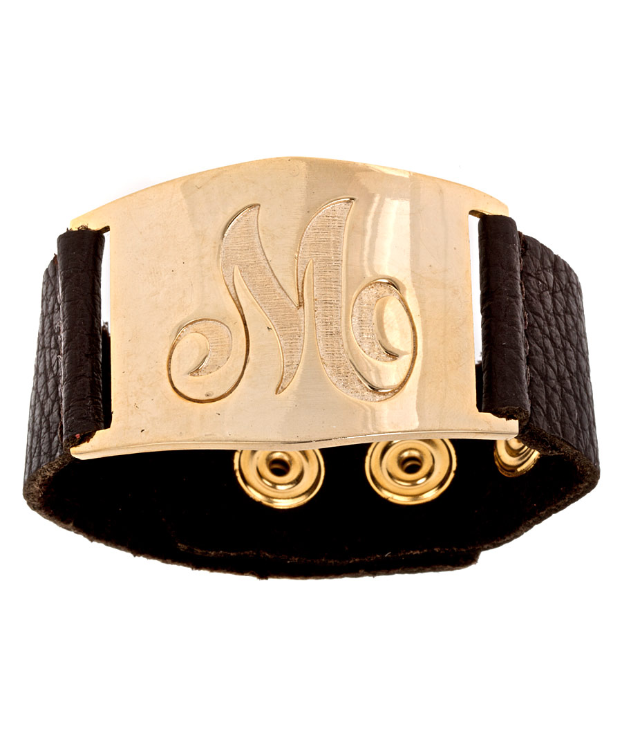 The Lisa Stewart serenity bracelet with engraved goldtone initial is a timeless way to advertise an initial of your choice. The brown leather wide band will only get more comfortable with age. The cuff fastens with three snap details for a perfect fit.