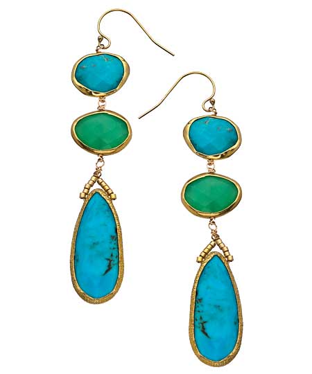 The turquoise & chrysoprase drop earrings from Liz Larios are sleek, cool and ready for anything. A sea green chrysoprase stone is lodged in between two turquoise gemstones in 18-karat gold plated settings. With their contemporary, stone-intensive