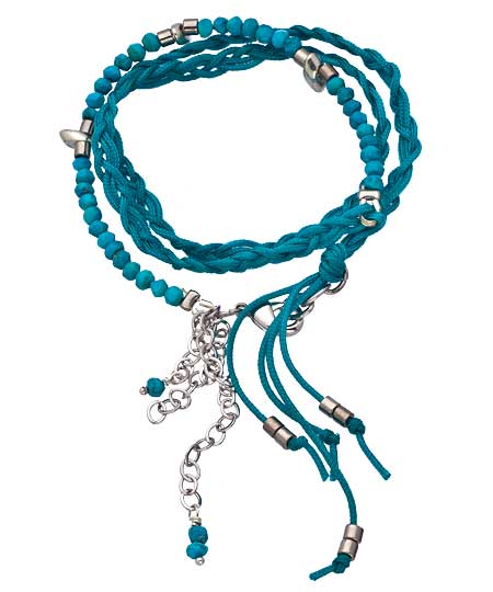 This playful turquoise wrap bracelet from Liz Larios decorates your wrist with the color of the ocean. Japanese glass and turquoise gemstone beads emerge with a macrame braid for a full 20-inches, plenty to wrap comfortably around your wrist three times. Wear it wrapped in neat rows, or crisscrossed for a more 'messy' profile.