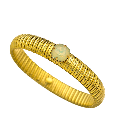 Slip this Liz Palacios desert glow bracelet around your wrist as soon as you can! It's a beautiful gold ribbed stretch bangle featuring an opalescent crystal that radiates an array of honey-colored hues. It will go beautifully with absolutely any outfit!