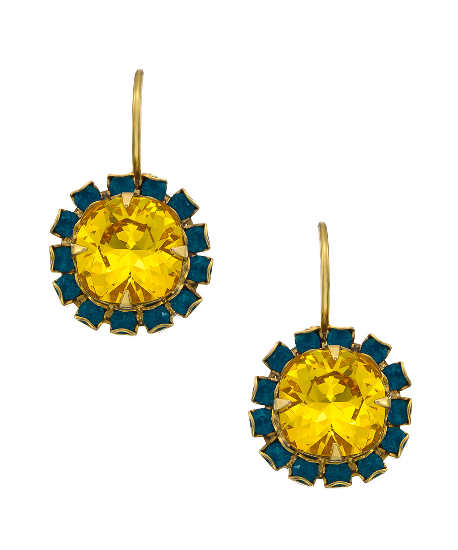Beautiful and with the perfect touch of whimsy, who can resist these Liz Palacios gold, caribbean blue opal and sunflower crystal drop earrings? Shimmering stones are further embellished with a frame of sparkling wonders for a look that’s luxurious and lovely. Earrings have a lever back closure for pierced ears.