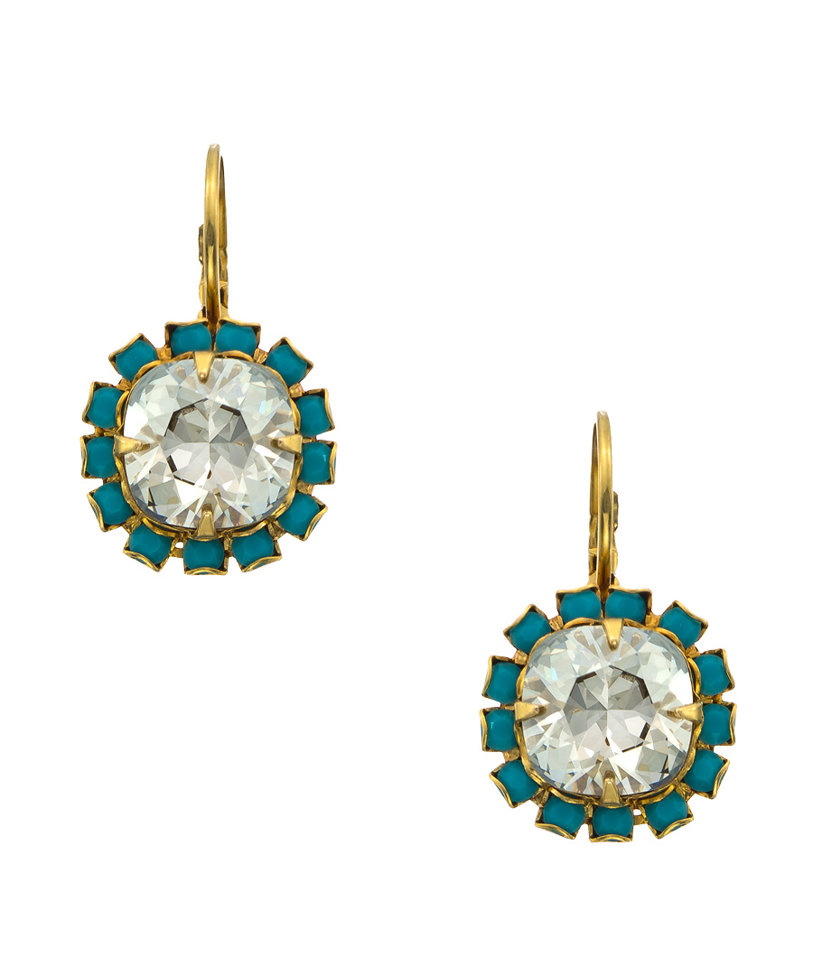 Liz Palacios scores another win, this time with these gold, turquoise and silver shade crystal drop earrings. Fun, funky and with lots of spirit, these earrings are the perfect pop of color for your favorite looks. Earrings have a lever back closure for pierced ears.