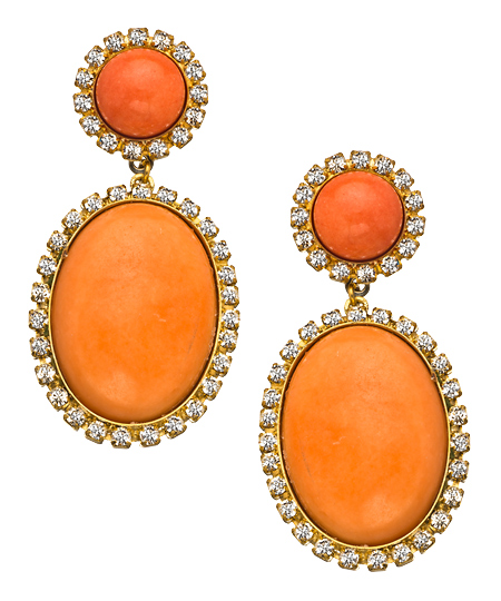 These Liz Palacios orange caboche and crystal drop earrings are perfect for when you want elegance without fussiness. Two dazzling orange caboche stones: one round and one a large oval, are surrounded with Swarovski crystals and have a post closure for pierced ears.