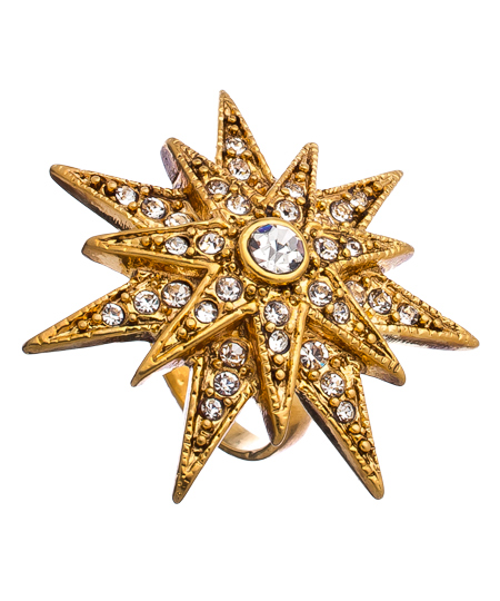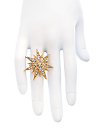 The gold crystal starburst ring from Crystal Streets is the epitome of a cocktail ring! Individual beams, accented with sparkling clear crystals, explode from the epicenter on a 24-karat gold plated band. With its elegant details and massive sparkle, you'll feel like a superstar while wearing it.