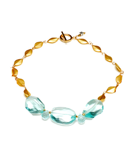 M. Flynn's Cleopatra rock necklace combines gorgeous color with graphic shapes and an opulent finish. Pool-blue quartz sparkles against gold-plated discs, and a toggle clasp adds a bit of interest to the back. You'll feel like a "rock" star in this sexy design.