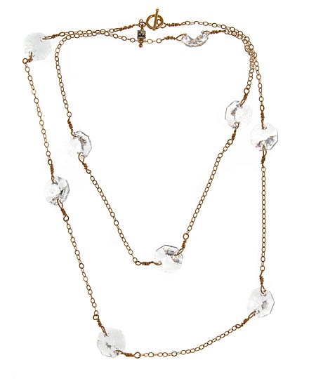 This crystal link necklace by M. Flynn is full of delicate appeal. The gold plated necklace has a beautiful thin link chain with a toggle closure. Nine faceted crystals line the 34-inch chain from one end to the other in a stunning fashion.
