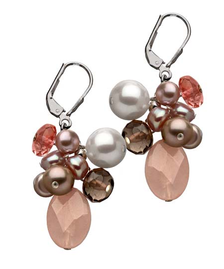 Give your outfit a feminine touch with the pink champagne cluster earrings from M Pearl. This collection of pretty stones includes smokey quartz, rose quartz, cherry quartz and freshwater pearls. These earrings fasten with lever back closures for pierced ears.