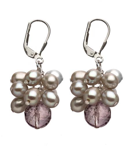 What's not to love about the sage and white pearl cluster earrings from M Pearl. This grouping of sage and white rice pearls is taken to the next level with the addition of the amethyst stone at the base. These earrings fasten with lever back closures for pierced ears.