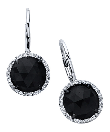 These Majolie onyx circle earrings are sure to make a statement that will be read loud and clear. The dark stone is bold in its appearance and in its size. Diamonds are speckled along the circular shape of the earrings and provide a great balance to the onyx stone in the center of the 14k white gold piece.