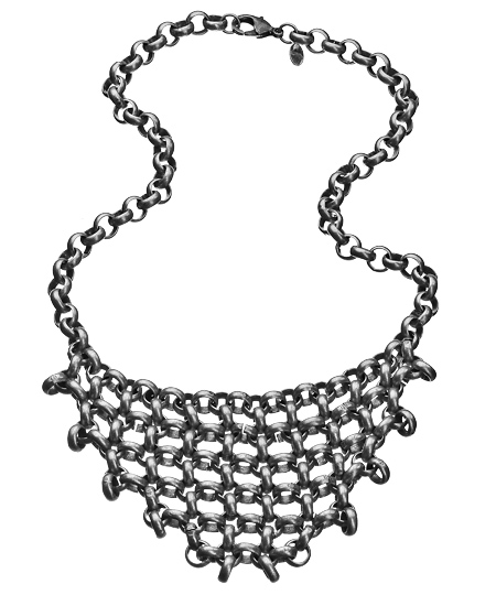 Breathe new life into your ensemble with this silver plated brass chain mail necklace from Marie Chavez. This necklace is designed in all silver plated chain. The bib portion of the necklace has a uniquely rugged flair. This necklace fastens with a lobster claw closure.