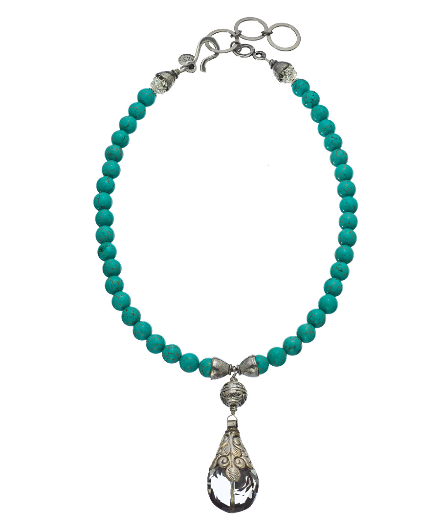 Marie Chavez's Tibetan turquoise necklace makes a bold, stylish statement that's perfect to top off work or weekend ensembles. It features clear Swarovski crystals, a silver Tibetan round bead, and a Tibetan crystal charm. Wear it with a favorite blouse or tee for looks that are always right on trend.
