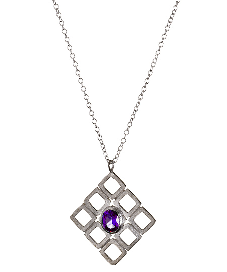 The Hayden sterling silver and purple necklace from Marie Todd is a modest piece with great style. The sterling silver pendant is smartly designed and sparkles with an amethyst color cubic zirconia. This chain fastens with a lobster claw closure.