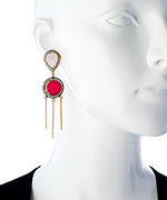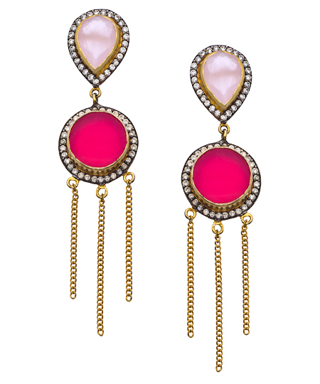 Opulence never goes out of style... only one reason that these gold CZ and smooth druzy chandelier earrings from Meghna Designs are going to claim a treasured place in your personal jewel collection! Teardrop shaped pink stones are linked to smooth, red druzies - each is surrounded by a frame of dazzling CZs. Three chains dangle from the bottom of each hypnotic, red stone. Earrings have a post closure for pierced ears.