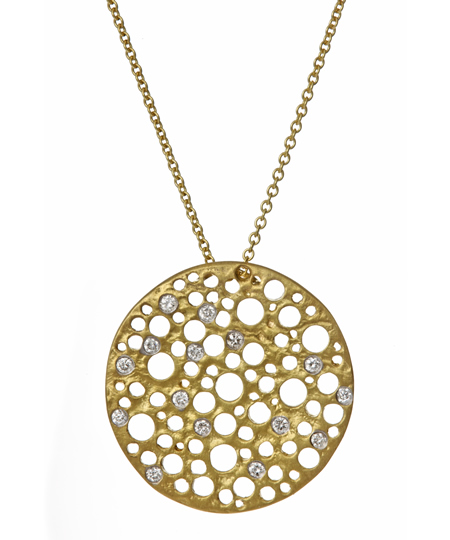 Meira T gold and diamonds bubble necklace is gorgeous. A 14k yellow gold disc features fabulous cutouts that look like tiny bubbles, much like those in a glass of champagne. Small diamonds add some incredible sparkle to the look. In total, this necklace boasts .25 carats of luminous diamonds. The pendant, which measures 1 inch in diameter, dangles from a brilliant 16 inch 14k yellow gold chain. Necklace fastens with a lobster claw clasp.