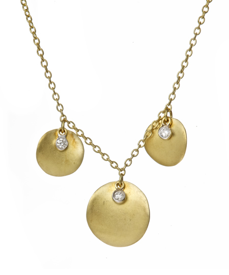 Meira T triple disc with diamond accent necklace is great addition to your fine jewelry collection. Three 14k yellow gold discs have a slight curve to them for an interesting look. Hanging in front of each disc is a small diamond for a touch of sparkle that is gorgeous. In total, this piece boasts .10 carats of diamonds. The 14k yellow gold chain measures 16 inches long, and fastens with a lobster claw clasp.
