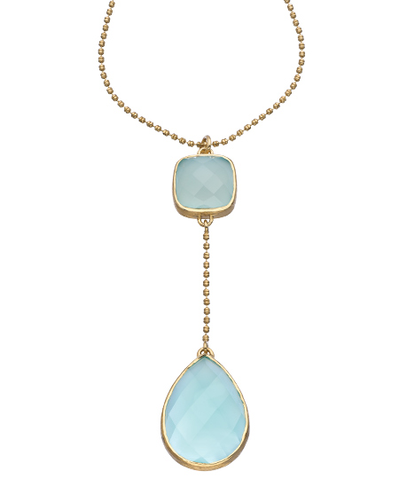 Melinda Maria's Clarence necklace was designed to get you noticed. The chain drop pendant includes two faceted gemstones; your choice of two turquoise, aqua onyx, or rock crystals. The pendant hangs from a gold plated ball link chain.