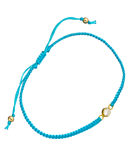 This aquamarine turquoise Lani macrame bracelet from Meredith Hahn is all about the exquisitely bold color. A sparkling bezel set cubic zirconia is bezel set in the middle for a touch of glam. Pull the nylon cord at each end to adjust the fit.