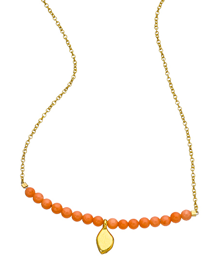 This coral single leaf charm Erin necklace from Meredith Hahn will capture your heart. The single leaf charm is diminutive but helps to add some grace to the necklace. This necklace fastens with a lobster claw closure.