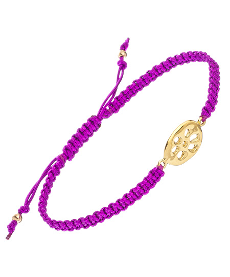 The Meredith Hahn Nadine lotus magenta macrame bracelet is a young and modern piece that looks great when stacked in multiples. The polished lotus detailed 18k gold vermeil charm shines against the bright woven band. This serene piece fastens with a simple macrame closure.